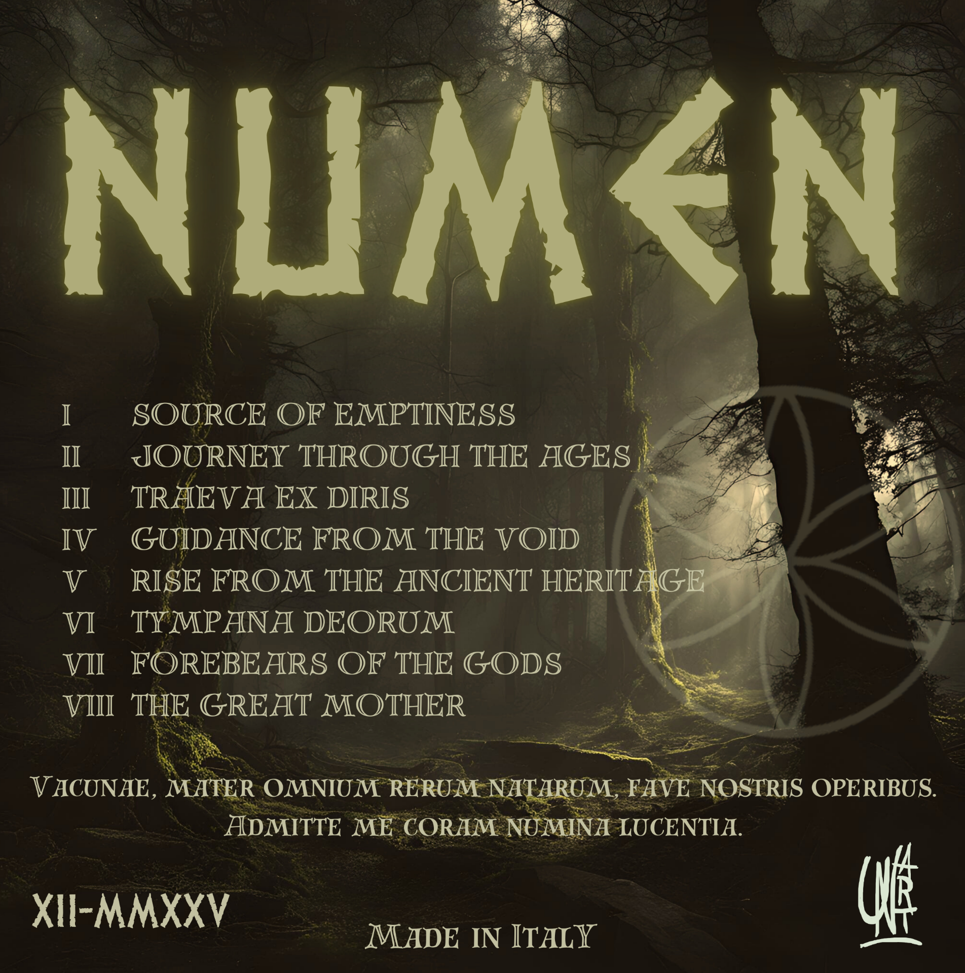 L'album VACUNAE RUSTICA NUMEN dei NUMEN è un viaggio sonoro che scende nelle profondità della spiritualità italica. Al suo cuore pulsa una tela di dark ambient, una base sonora oscura e avvolgente che avvolge l'ascoltatore in un'atmosfera di mistero e contemplazione. Su questo sfondo, le orchestre irrompono con squarci di grandezza e malinconia, creando un'epica che non ha bisogno di parole. Il pianoforte agisce come una voce solitaria e riflessiva, una guida emotiva in un paesaggio sonoro dove il sacro e il primordiale si incontrano.